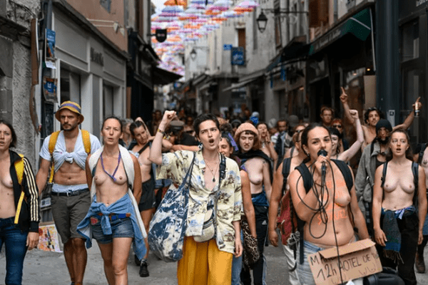 Jeudi, en plein épisode caniculaire Marina, festivalière à Aurillac, ôte son tee-shirt, imitant les hommes torses nus autour d’elle. Alors qu’elle se promène seins nus, la police la contrôle. Elle est interpellée pour "exhibition sexuelle". Une vague d’indignation s’ensuit. Samedi, plus d’un millier de femmes et d’hommes défilaient, majoritairement torses nus, en soutien à Marina. Les slogans « Libérons nos tétons de vos regards cochons » ou encore « Aurillac topless, la police en PLS ».