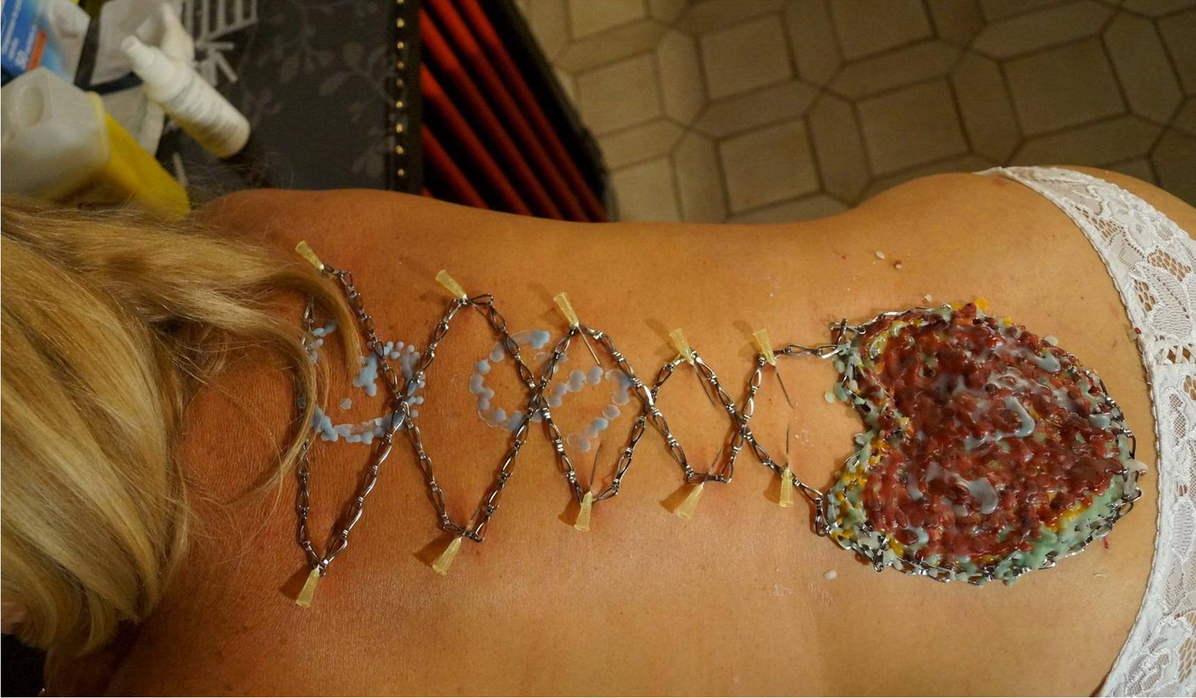 200 aiguilles ont été posées en mode escargot sur le dos d'une de mes soumises maso. Ces aiguilles traversaient un ruban. Après m'être amusé à faire glisser le doigt sur les aiguilles à la façon d'un musicien fou, (elle a adoré les sensations) je l'ai attachée debout (par sécurité et j'ai bien fait) pour retirer les 204 aiguilles assez rapidement en tirant sur le ruban.